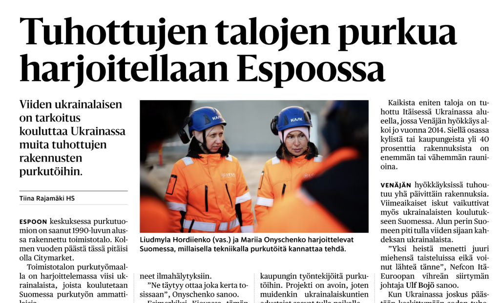 Tässä kohtaa suomalainen purkuosaaminen astuu kuvaan, ja siitä myös Helsingin Sanomat kirjoitti. 23.11.2025 julkaistu artikkeli toi esiin Lotus Demolitionin ja Nefcon yhteisen koulutushankkeen, jossa viisi ukrainalaista – kolme naista ja kaksi miestä – opiskelee Suomessa purkutyön ammattilaisiksi.